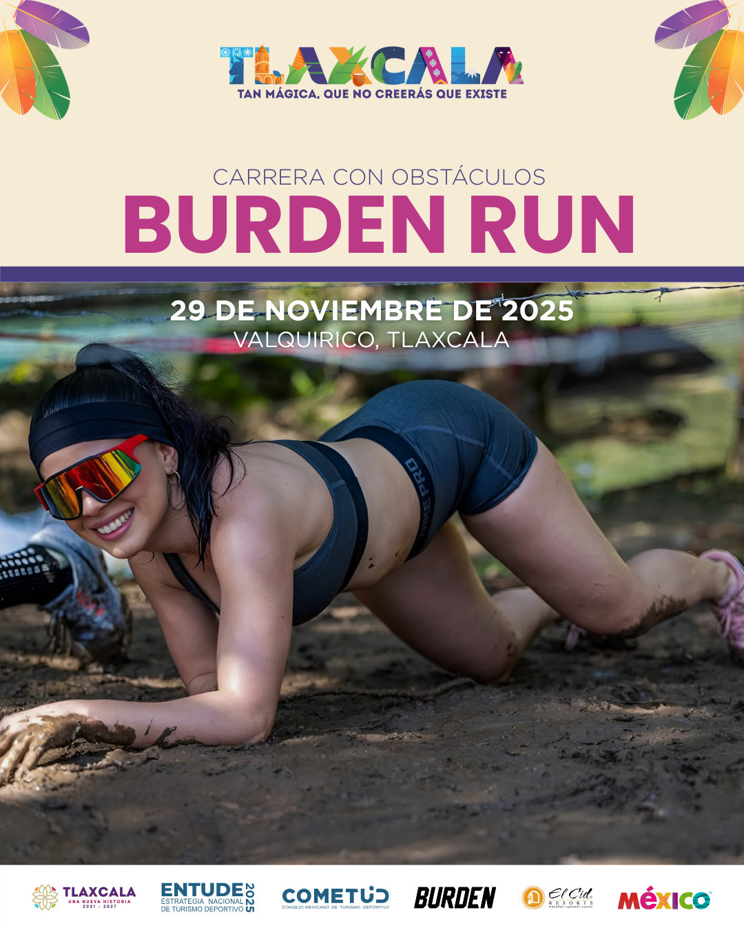 Burden es una carrera de obstáculos de 5 y 10 km, en formatos individual, pareja o equipo. Diseñada para fomentar el desarrollo físico y mental, esta competencia reta a los participantes a superar pruebas de fuerza, resistencia y estrategia. El evento busca incentivar el turismo deportivo en Tlaxcala, atrayendo a atletas de distintos niveles y estados del país en un entorno de aventura y superación personal.